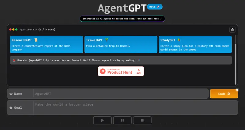 AgentGPT, developed by Reworkd AI, is an open-source platform that enables users to create and deploy autonomous AI agents directly in their browser. Powered by GPT-3.5 and GPT-4, it allows users to assign goals to custom AI agents, which autonomously plan, execute tasks, and learn from results. Launched in April 2023, it has gained popularity for its ease of use and versatility in automating tasks across various domains.