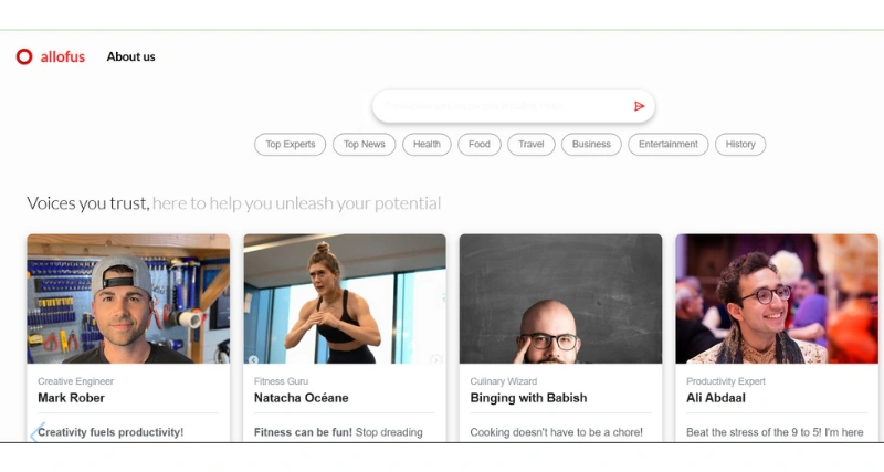 Allofus.ai is an AI-powered platform designed to facilitate real-time conversations with virtual experts across diverse fields such as health, food, travel, business, entertainment, and history. By engaging with AI personas, users can access personalized guidance, insights, and information tailored to their interests and needs. The platform emphasizes that the individuals depicted are AI representations intended for informational, educational, and entertainment purposes, and it advises consulting real experts for professional advice