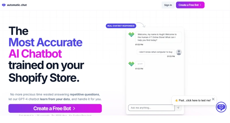 Automatic Chat is an advanced AI chatbot platform that leverages GPT-4 technology to provide accurate and instant responses on your website. Designed to enhance customer support and engagement, it operates 24/7, handling complex inquiries seamlessly. The platform supports over 26 languages, making it suitable for a global audience.