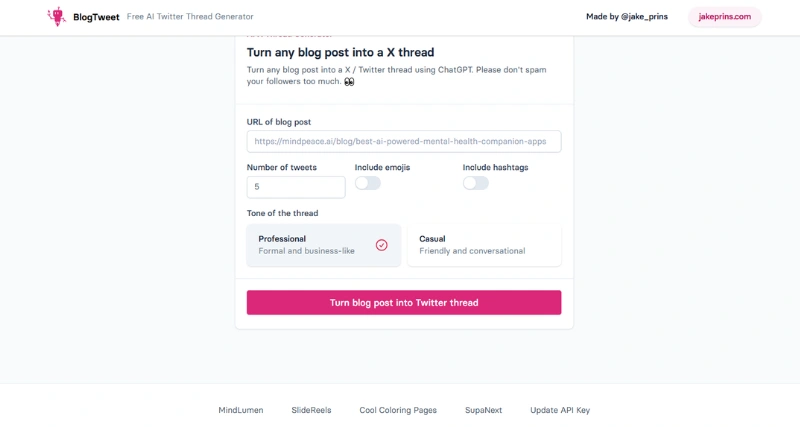 BlogTweet is an AI-powered tool that transforms blog posts into engaging Twitter threads using ChatGPT. Developed by @jake_prins, it streamlines content repurposing, allowing users to share their blog content on Twitter efficiently. This AI-powered tool seamlessly transforms your blog posts into perfectly optimized Twitter threads, boosting your visibility and sparking conversations on the platform.