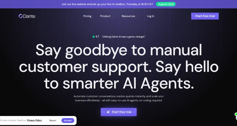 Dante AI is a cutting-edge platform that empowers businesses to create intelligent and engaging chatbots. By leveraging advanced AI technology, It enables users to build custom chatbots tailored to their specific needs without requiring extensive technical expertise.