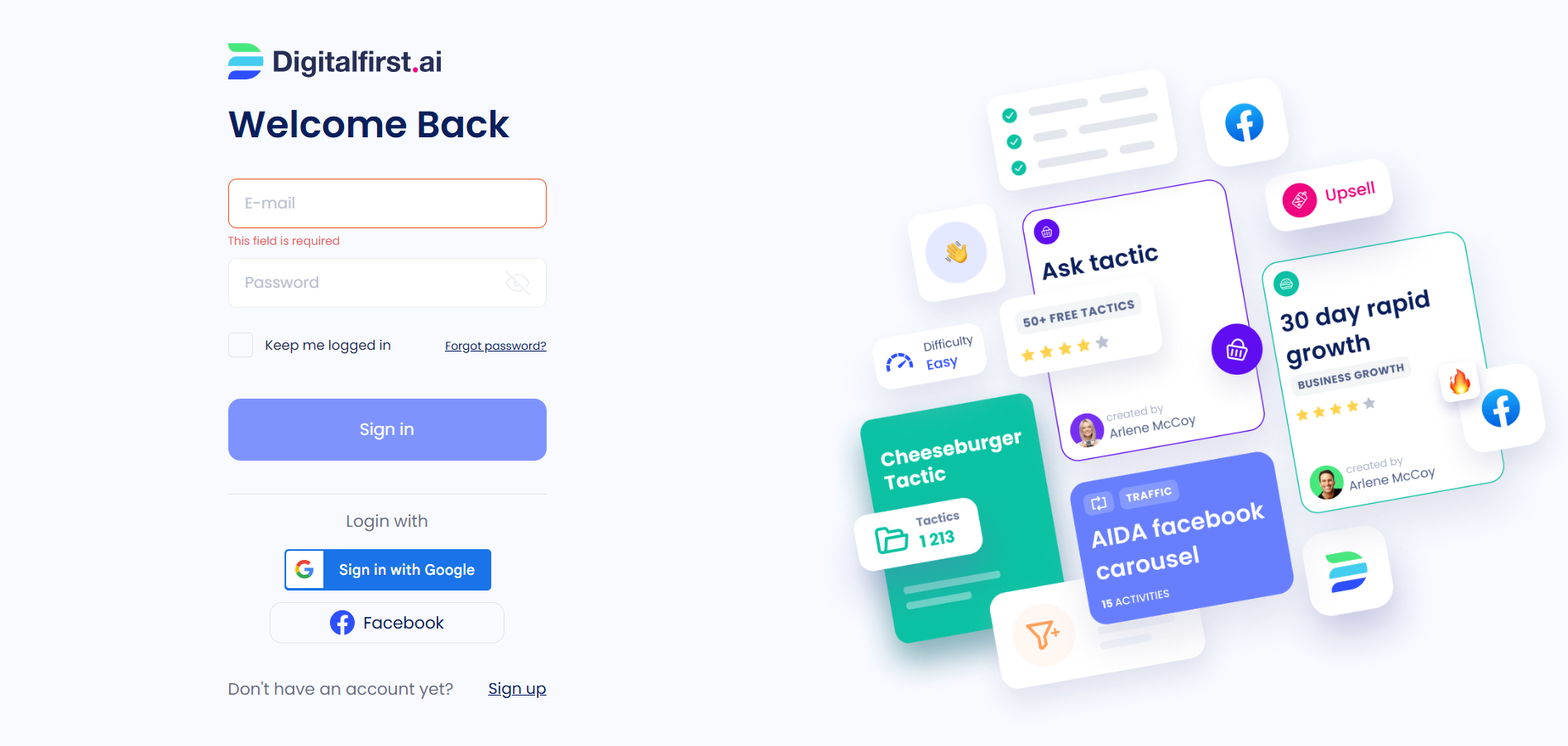 Digital First AI is an AI-powered marketing platform that provides users with a library of tactics, community-driven approach, and automated features to help them grow their businesses.