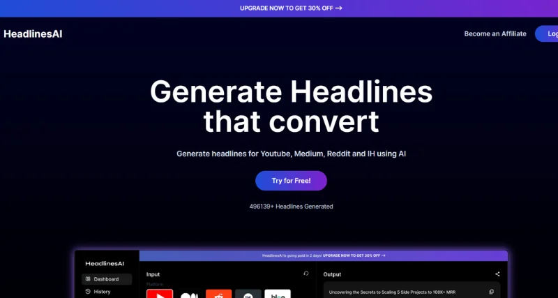 HeadlinesAI is an AI-based tool that generates high-converting headlines for different platforms, including Medium, Reddit, YouTube, and Indie hackers. It offers improved click-through rates, social media sharing, and caters to various content creators, such as bloggers, marketers, and social media managers. The tool is user-friendly and accessible, with a limited-time 30% discount offer available.