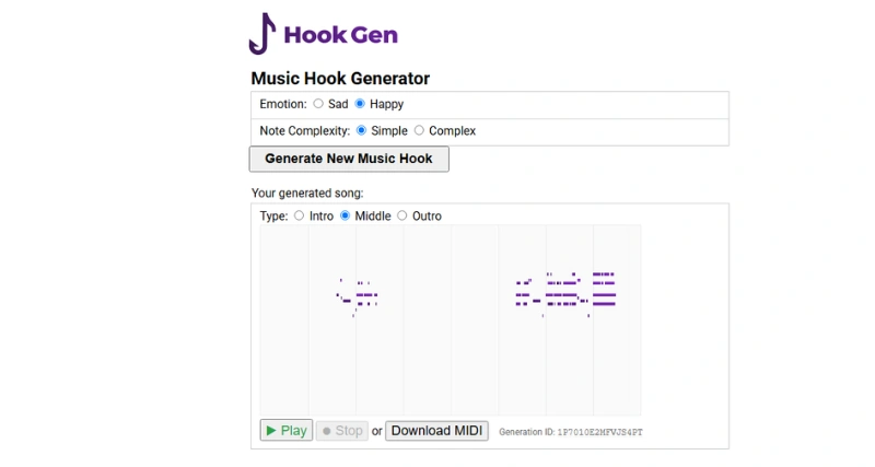 Hook Gen is a web application that uses artificial intelligence to generate captivating music hooks and melodies for music producers and songwriters. It allows users to create songs with various instruments such as piano, drums, strings, brass, guitar, and bass, with additional instruments available in future updates. The application offers free and royalty-free downloads of the generated MIDI files, and gathers user data to improve the AI’s song generation capabilities.