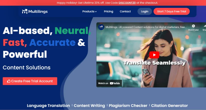 Multilings is an AI-powered tool that offers a range of features, including natural translation, plagiarism checking, grammar correction, citation generation, content writing, and voice conversion. Multilings provides fast, accurate, and secure translations in over 75 languages, ensuring that the translated content sounds natural to the target audience.