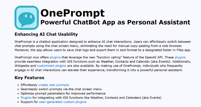 OnePrompt is an iOS chatbot application that enhances AI chat interactions by offering seamless prompt management, integration with iOS features, and robust customization options. It is a chatbot application that improves AI chat interactions by offering various features.