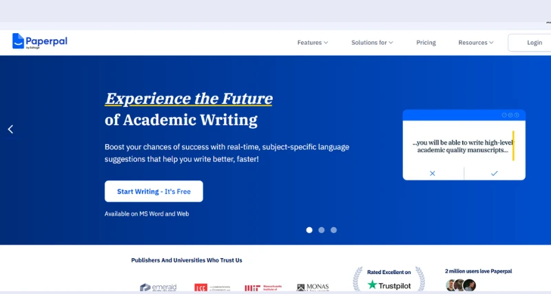 Endorsed by top publishers, Paperpal offers seamless integration with various platforms including manuscript, web, and Word. Use cases include researchers and academics, academic writers and authors, students, and scholars looking to improve their academic writing for research papers and dissertations.