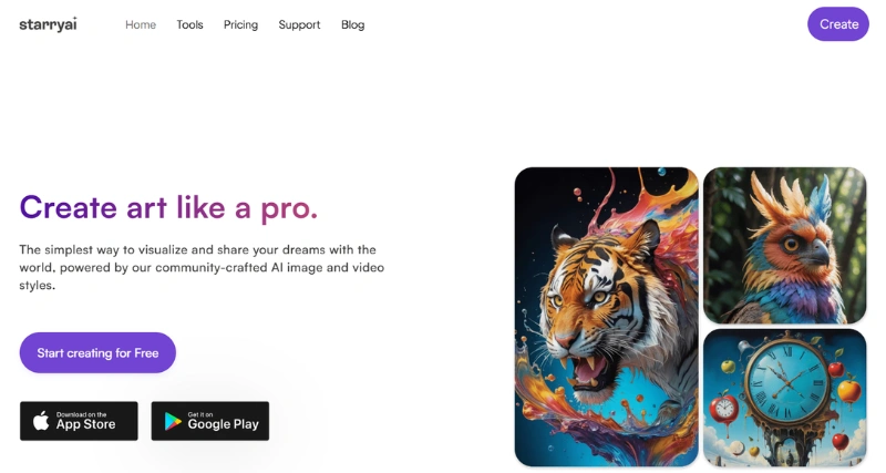 Starryai is an AI art generator app that turns words into mesmerizing works of art using artificial intelligence. It is available for both iOS and Android devices and can be easily downloaded for free. The app has a user-friendly interface that allows users to enter text prompts and generate art in minutes. Customization options include choosing from various AI models, styles, aspect ratios, and initial images. Users can generate up to five AI artworks daily without watermarks, retain full ownership of their creations, and receive regular updates with the latest AI methods and improvements. It has been featured in media outlets and highly rated by users.